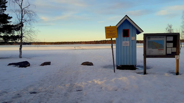 Kuva Pyykösjärven uimarannalta. Oulussa on vielä ihan hyvä lumitilanne! Itse asiassa eilen satoi lunta ja sitä myös jäi, jonka ansiosta tänäaamuna oli ajettu ihan kaikki lenkit Virpiniemessä ja kelpasi siellä hiihtäjän auringonpaisteessa hiihdellä!